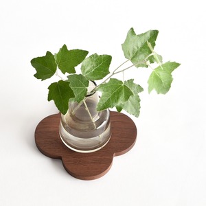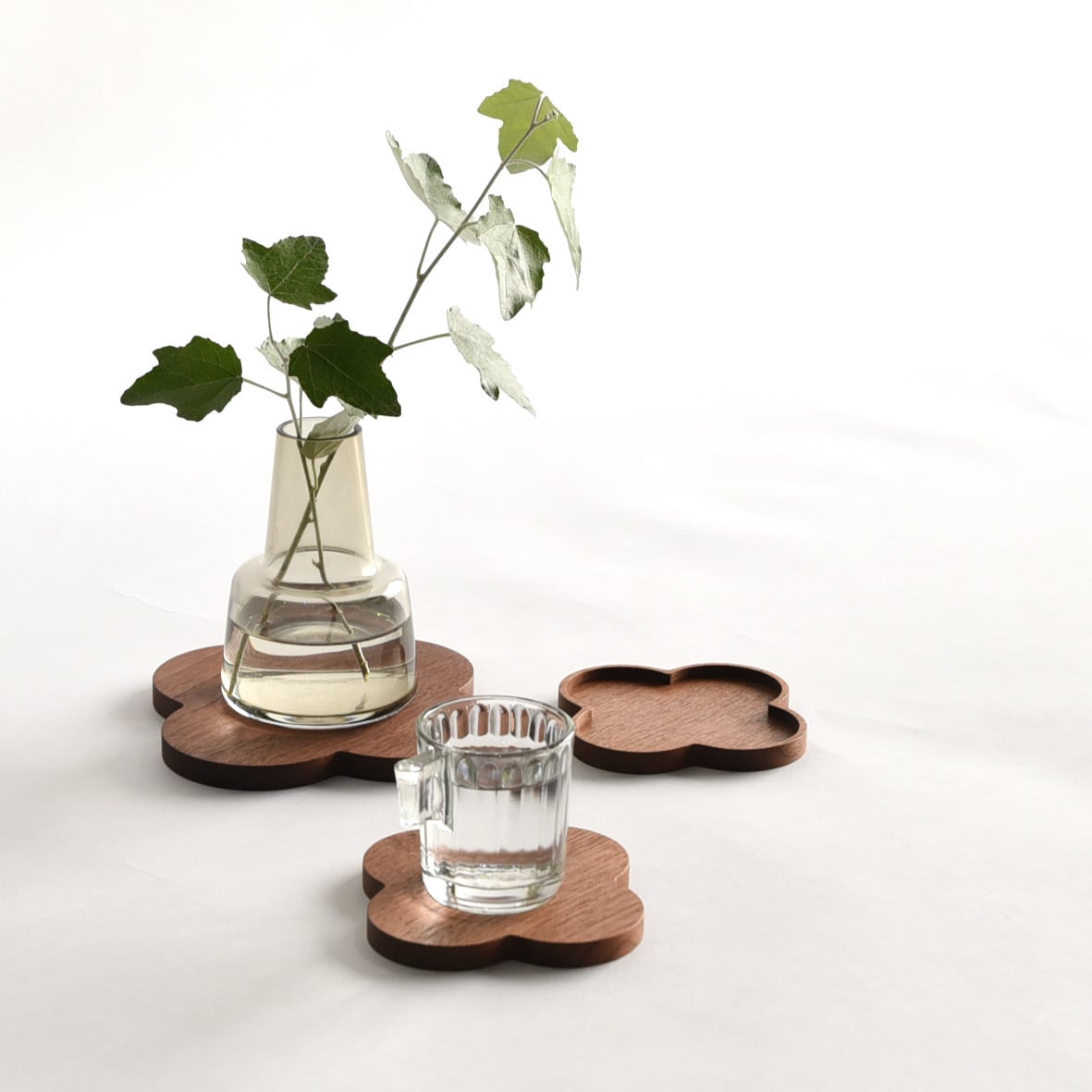 ガラスのベース等を置いて、四つ葉のコースターと共に。
