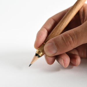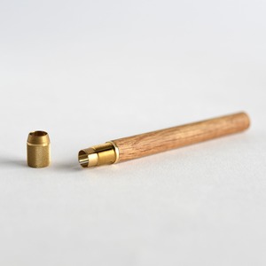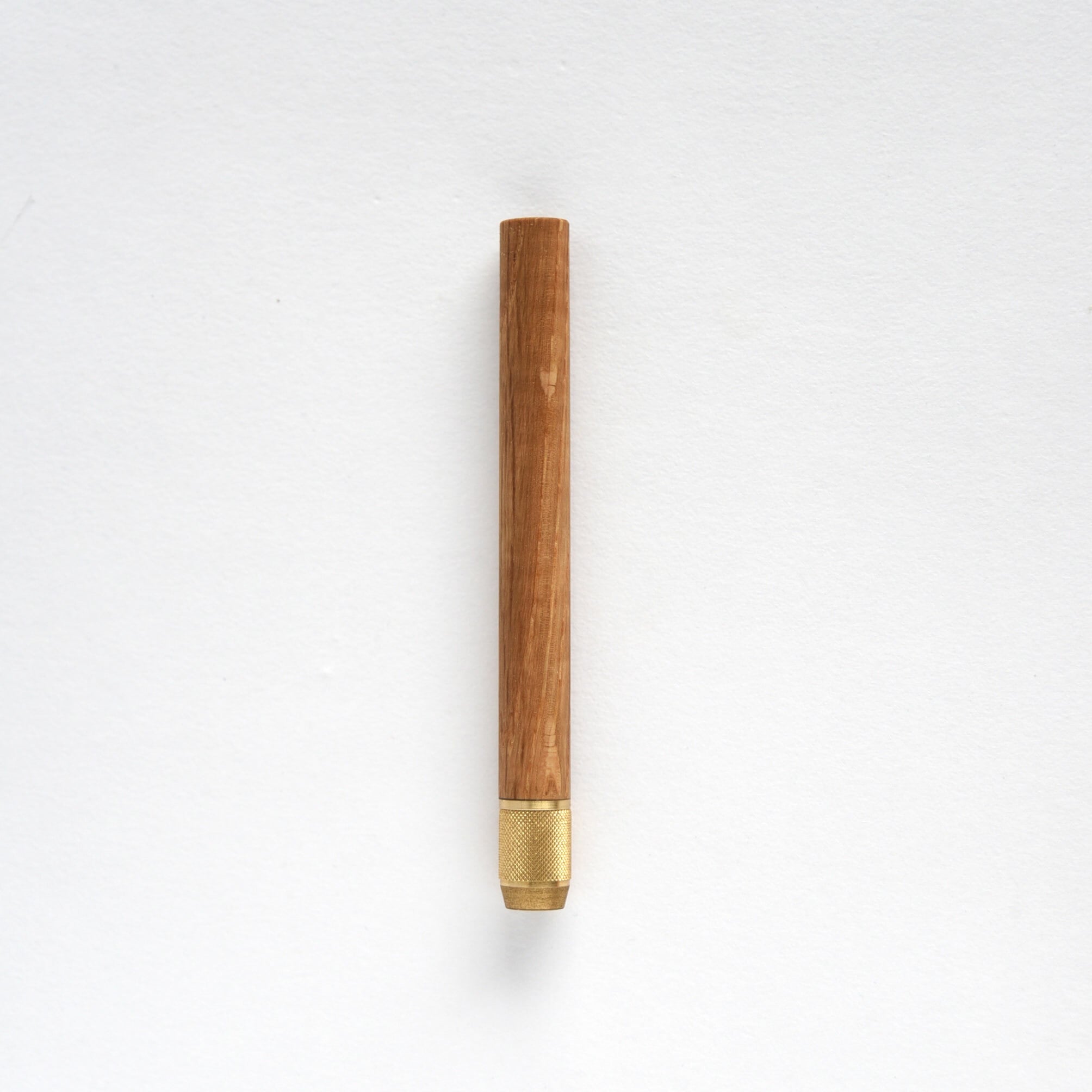 木の補助軸。 ならと真鍮で制作しました。 エクステンダーとも呼ばれ、短くなった鉛筆を使い続けられるようにする道具です。 特徴は、グリップのローレットを細かくし、鉛筆を固定する際に必要十分なものにしています。 また、直径がΦ11mmで木製の補助軸では最小径で制作しているため、スマートな補助軸になっています。