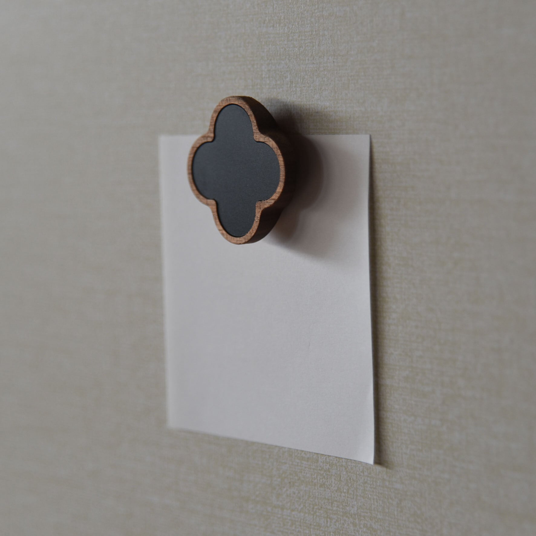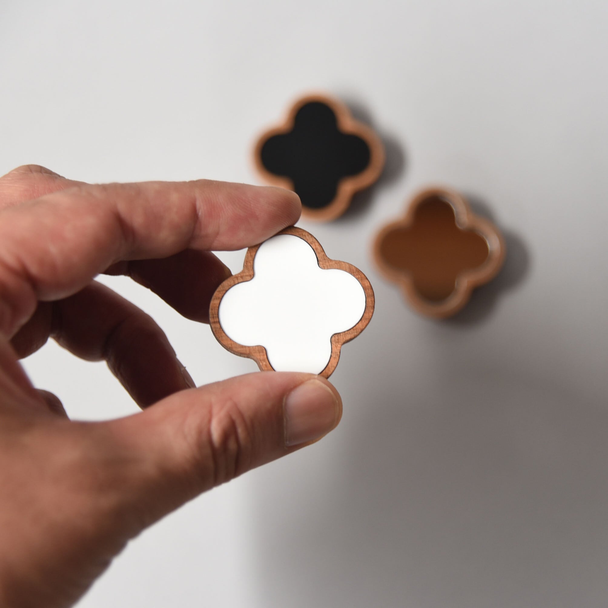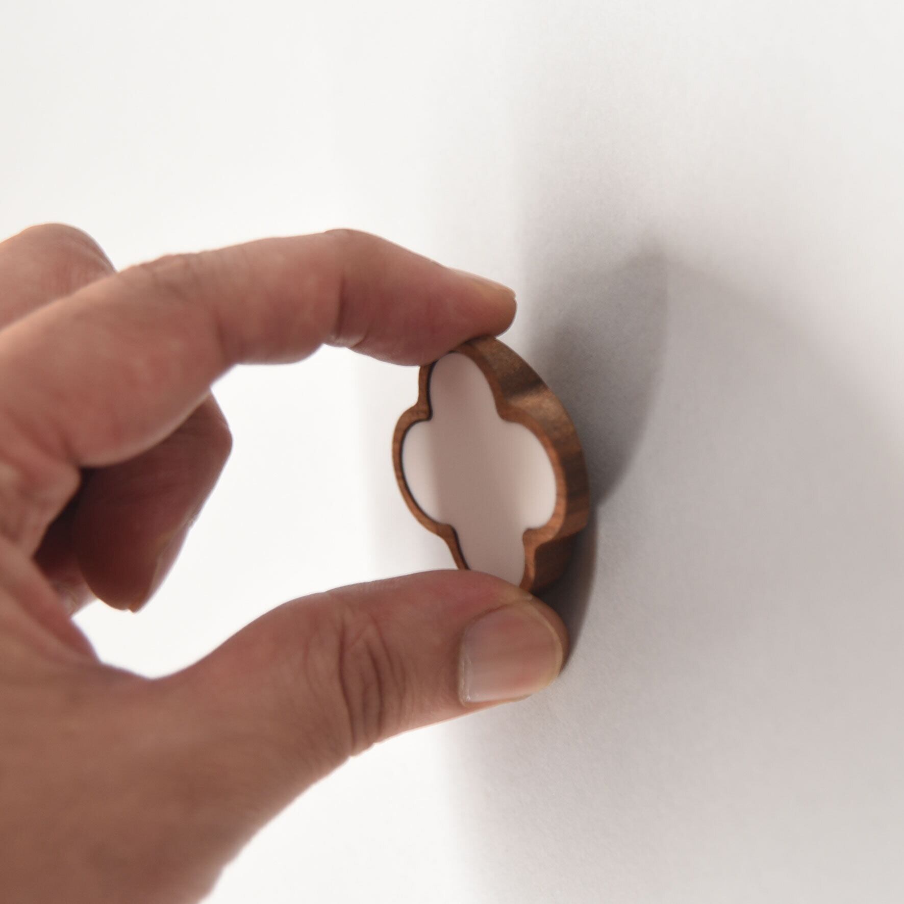2個入り 四葉のマグネット。 強力マグネットでA4コピー用紙5枚まで保持します。 白+ミラー、黒+ミラーからお選びいただけます。 オイル塗装 くるみ、さくらはお選びいただけません。 ※表示価格は2個入1セットの単価です。 サイズ直径約40mm 厚み約10mm 素材くるみorさくら、アクリル