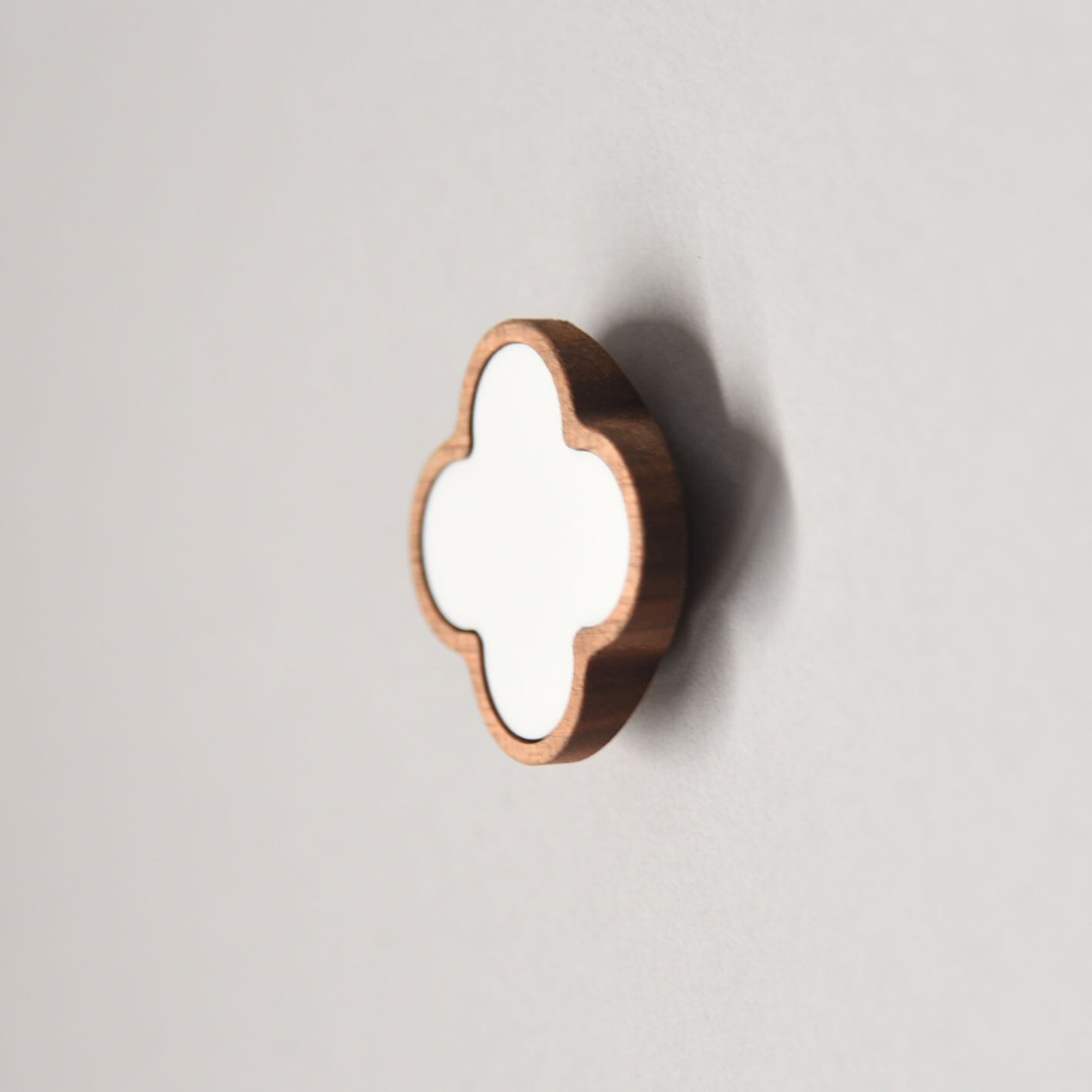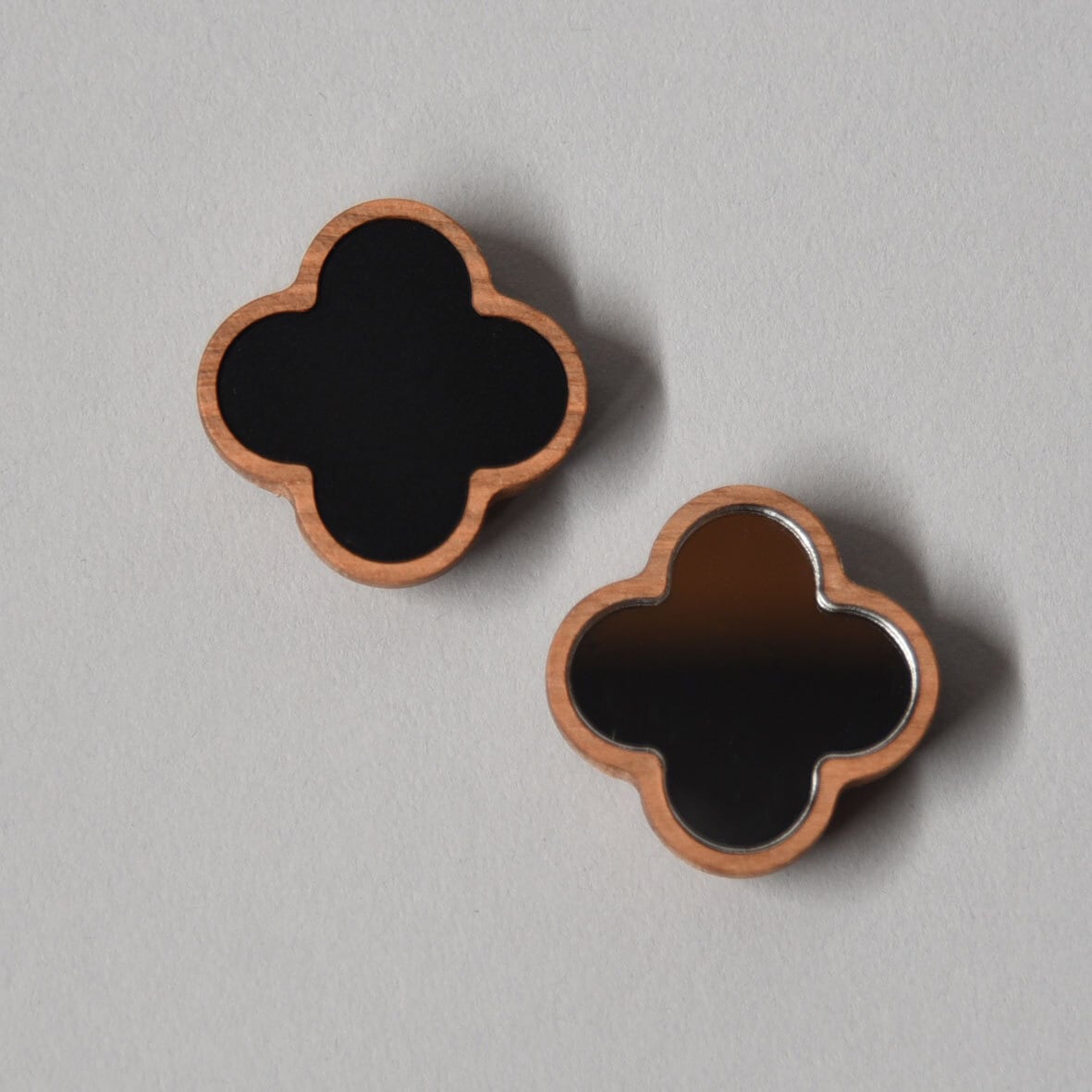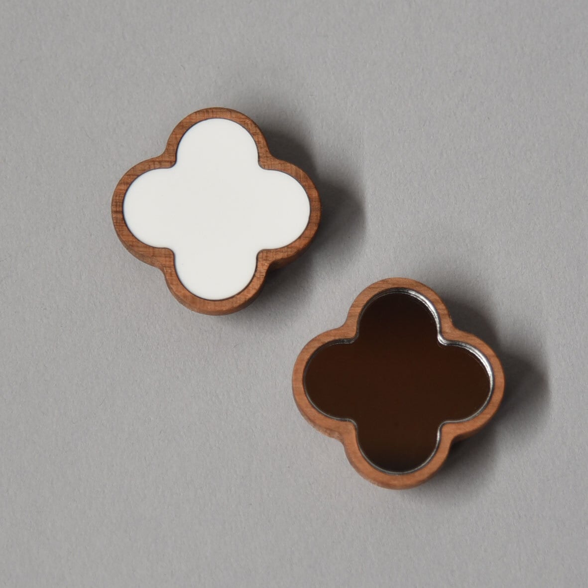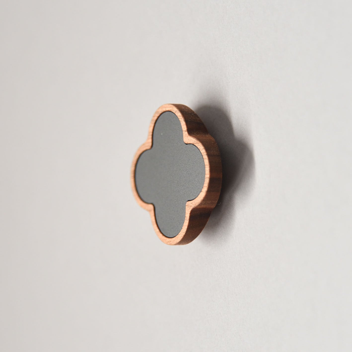 2個入り 四葉のマグネット。 強力マグネットでA4コピー用紙5枚まで保持します。 白+ミラー、黒+ミラーからお選びいただけます。 オイル塗装 くるみ、さくらはお選びいただけません。 ※表示価格は2個入1セットの単価です。 サイズ直径約40mm 厚み約10mm 素材くるみorさくら、アクリル
