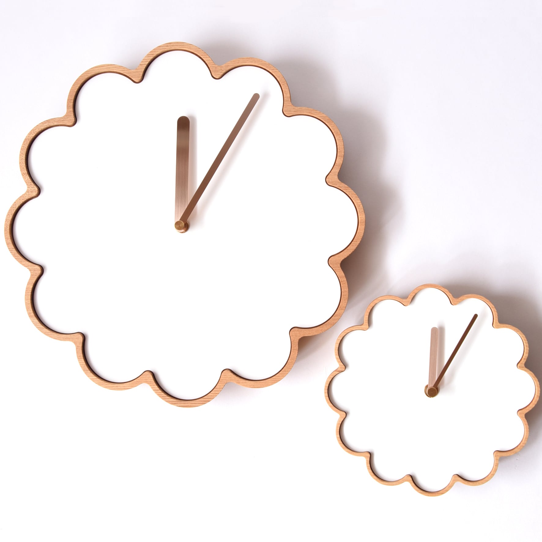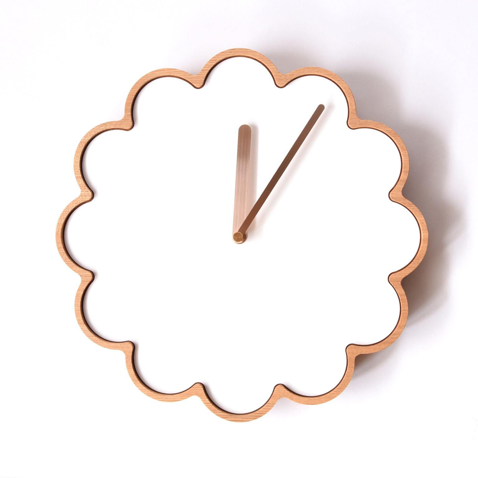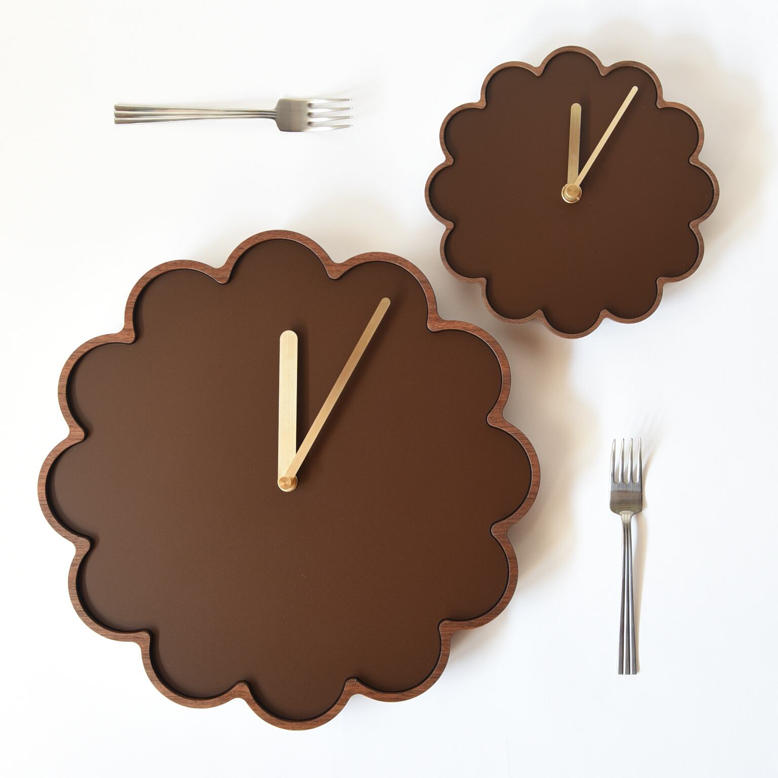 タモorウォールナットの木で製作したタルトの壁掛け時計です。(1、4枚目picはタルトの時計Lとの比較) 面材はクリーム→白色、チョコレート→茶色 木部の仕上げはオイル仕上げ、針のリン青銅or真鍮は無塗装となっており、経年変化をお楽しみいただけます。