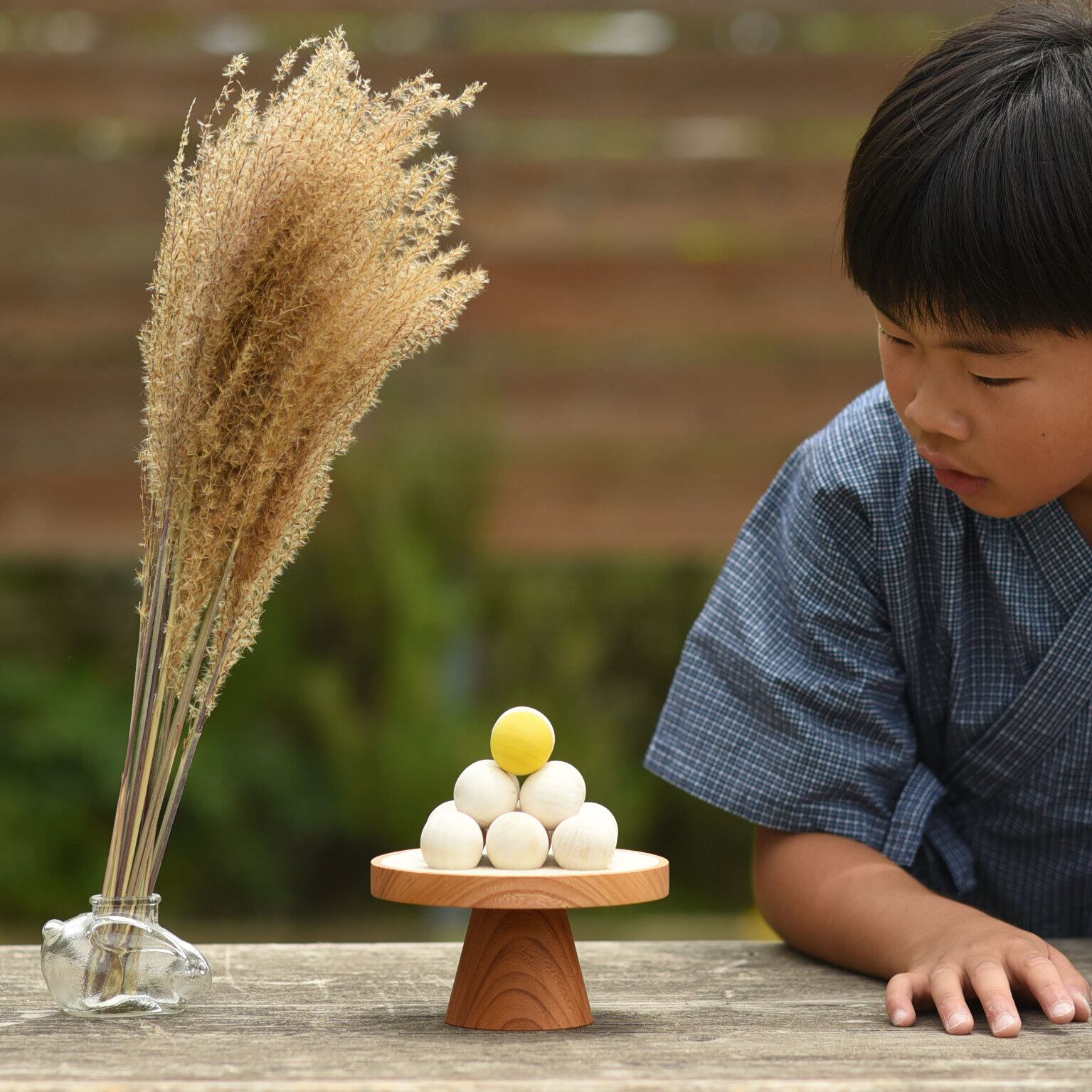 15個のお団子を再現しつつ、三方と呼ばれる台はインテリアになじむようモダンな形にしました。