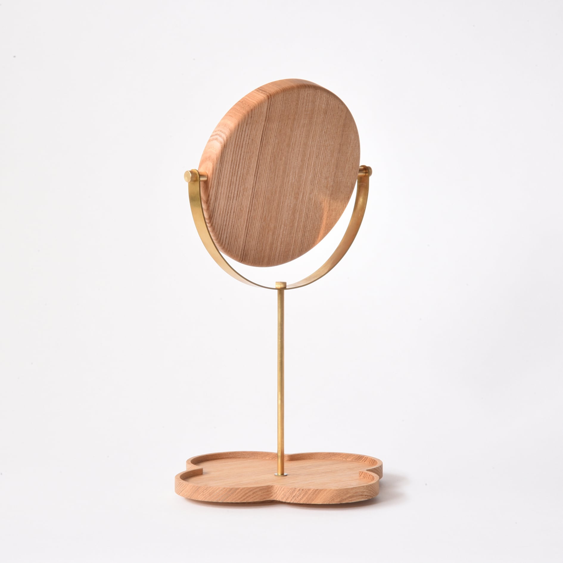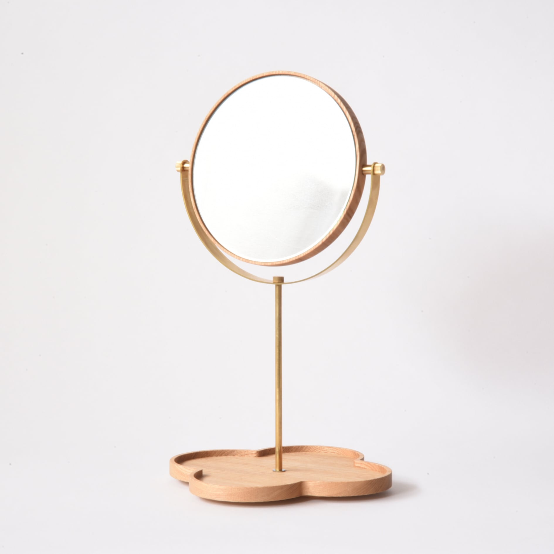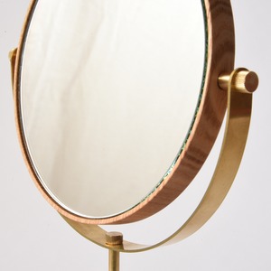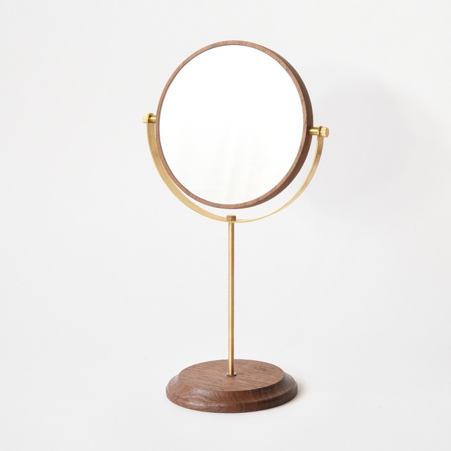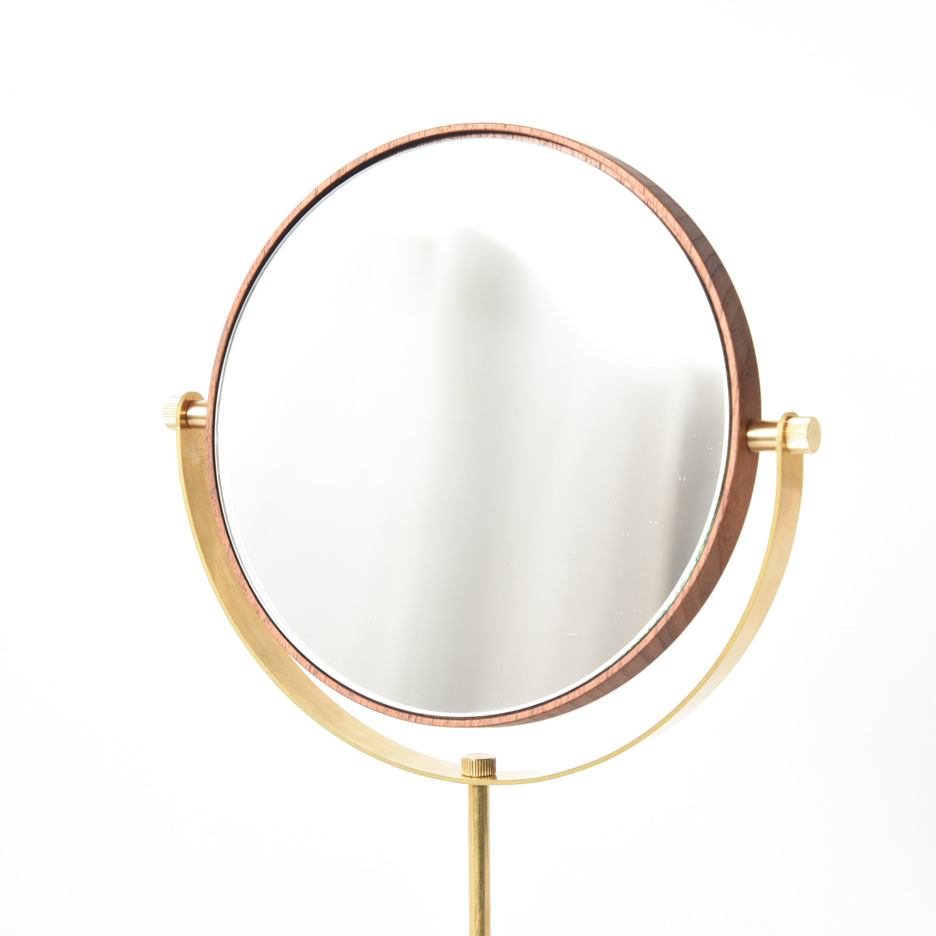 木と真鍮で製作した置き鏡です。 組立式になっております。 真鍮は無塗装で錆が出てきます。また、お届け時に既にある場合もございます。商品の特徴としてご理解ください。 重さ 約 300g サイズ H約290mm 鏡 直径 Φ130mm 素材 ウォールナット、真鍮